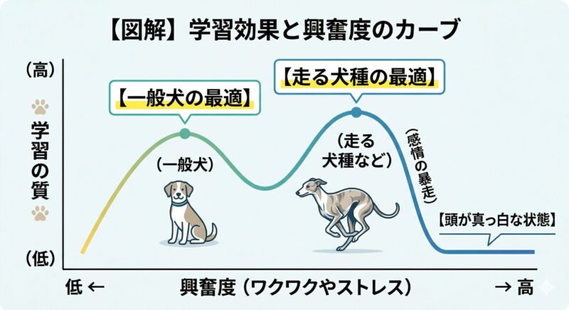 一般的な犬は、少しでも環境が変わって興奮度が高まると、すぐに一番右側の「頭が真っ白な状態」に達して学習できなくなります。しかし、走ることに特化した犬種などは、ルアーを追うような「高い興奮状態(右側にシフトしたカーブ)」の中にあっても、学習が成立する特異な能力を持っています。 ただし、その彼らでさえ限界を超えてしまえば、理性が吹き飛び、指示は一切届かなくなります。このグラフの頂点(ワクワクしているけれど、まだ飼い主の声が聞こえるバランス)を見極めることが非常に重要です。