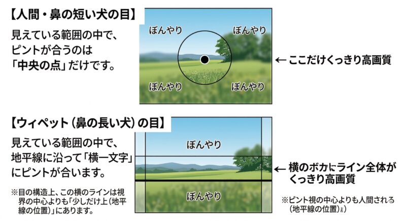 犬の目は人間と大きく異なりますが、走ることに特化した犬種はさらに特殊な目の構造を持っています。彼らの目の奥には、地平線に沿って横一文字にピントがくっきりと合う「視覚の帯」と呼ばれる超高解像度エリアが存在します。