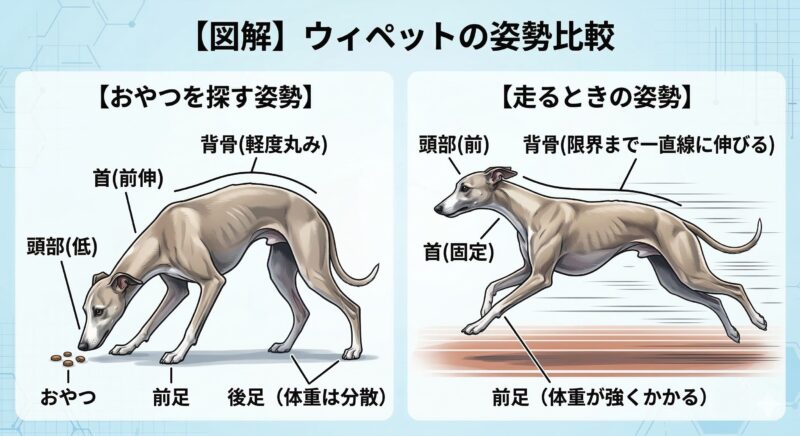 おやつを探す際、頭を下げてゆっくりと複雑な方向に体を捻りながら匂いを追う動作は、関節に強い負担をかけずに、この背骨周辺の柔軟性を保つ(サスペンションのオイル交換のような)効果があります。腰が硬くなると急激にタイムが落ちるウィペットにとって、この柔軟性維持はトップスピードを保つための命綱なのです。[参考文献:5]