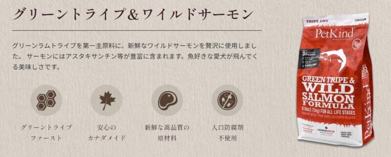 グリーントライプ&ワイルドサーモン30.0%以上16.0%以上4.0%以下10.0%以下7.0%以下記載なし0.8%以上0.10%以下2,790mg/kg以上359.6kcal