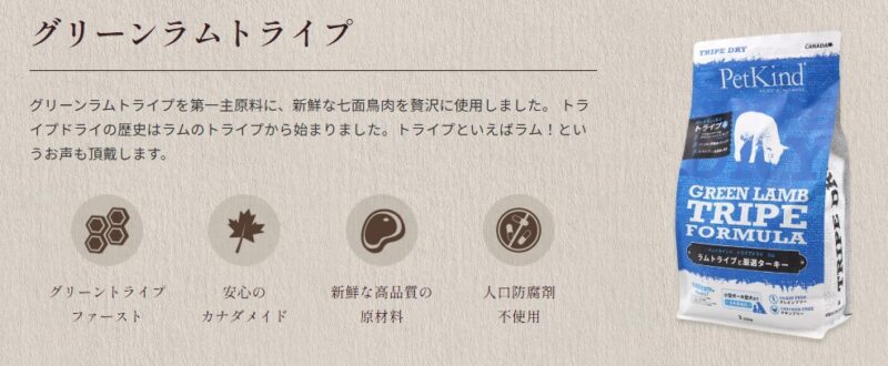 グリーンラムトライプ30.0%以上16.0%以上4.0%以下10.0%以下7.0%以下記載なし0.8%以上0.10%以下2,790mg/kg以上360.8kcal