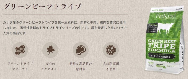 グリーンビーフトライプ32.0%以上16.0%以上4.0%以下10.0%以下8.5%以下記載なし0.8%以上0.10%以下2,790mg/kg以上365.7kcal