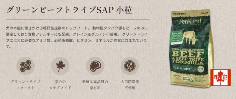 グリーンビーフトライプ SAP 小粒2.4%以上1.2%以上約 2.0 : 1高タンパク+脂肪酸バランスもまずまず