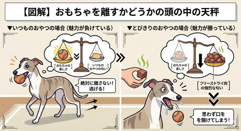 犬の頭の中もこれと全く同じです。くわえているおもちゃを離してほしい時に、いつもの見慣れたドライフードを差し出しても、犬にとっては交換する魅力がありません。愛犬が言うことを聞かないのは、反抗しているのではなく「今くわえている宝物を手放すほどの価値がない」と素直に判断しているだけなのです。