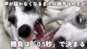 ウィペットにとって、逃げる犬は「最高に楽しい獲物」に見えてしまいます。「追いかけっこ」が本格的に始まって、相手の犬が嫌がっているのに止められない状態(脳が快感ループに入った状態)になってからでは、呼び戻すことはほぼ不可能です。