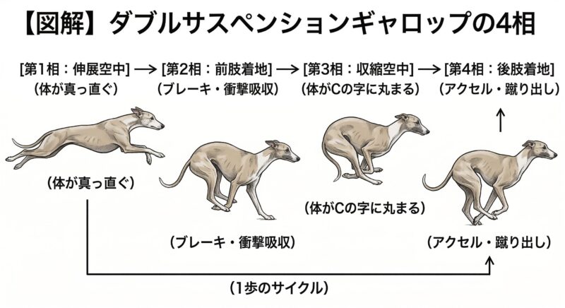 歩幅を最大化するダブルサスペンションギャロップの4フェーズと、加速を支える筋膜のゴム弾性。 - 競技で勝つための路面・カーブ攻略