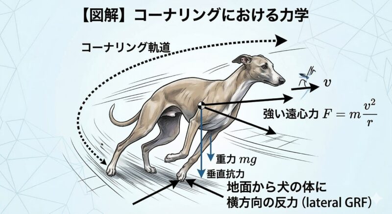コーナリングでは強い遠心力がかかり、地面から犬の体に横方向の反力が返ってきます。