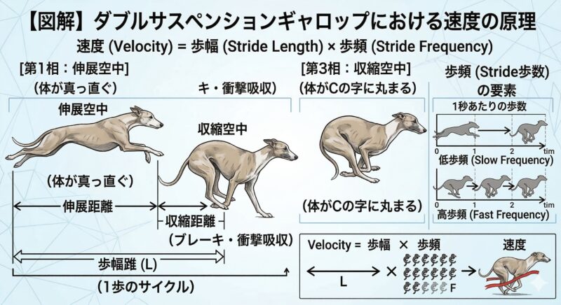 脚の筋肉量だけでなく、背骨のダイナミックな動き(Spinal Engine的要素)と、空中に2回浮くダブルサスペンションギャロップによって、自身の体格を遥かに上回る「ストライド(歩幅)」を生み出せるためです。脚の回転の速さだけでなく、一歩の伸びが桁違いなのです。
